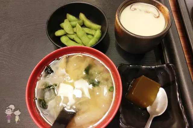 四樣附餐分別為味噌湯、毛豆、茶碗蒸跟甜點,感覺蠻超值的組合。