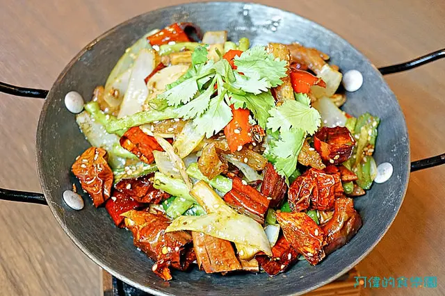 來自新疆與四川的特色菜,用了辣椒、洋蔥不加一滴水爆炒肥腸,結合孜然香,是一道重口味的菜。