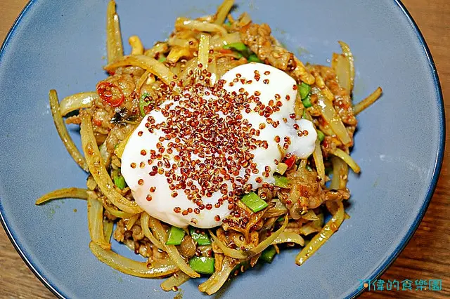 蛋上撒的是”紅藜麥”,據說是一種對健康有益的植物,跟著溫泉蛋黃與牛肉、洋蔥混合,增加些微穀物的纖維口感。