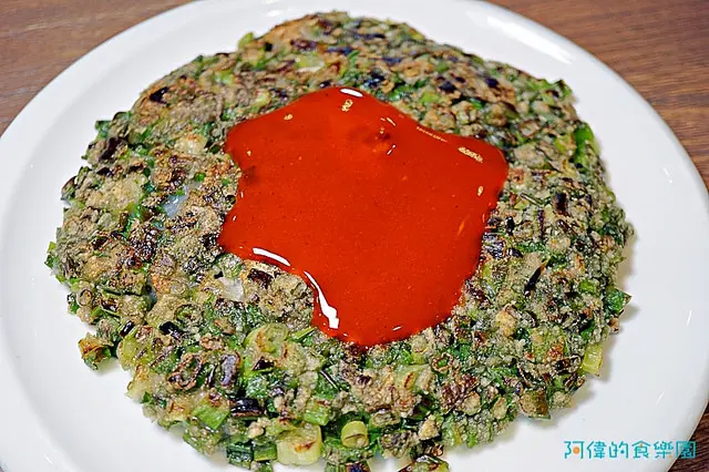 這道是把傳統的台灣小吃蚵仔煎經過變化之後而成,用大量的青蔥跟蚵仔結合,帶點鹹鮮味。再淋上「東泉辣椒醬」,微辣中帶點甜,這樣吃起來更有風味。