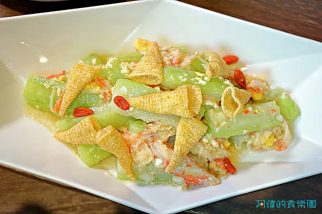 這是一道有創意又清爽的菜餚,將瓜角與金沙(鹹蛋)拌炒,甜甜鹹鹹的;再加上散落的「金牛角」,會讓人想起小時候,有種懷舊的風情。