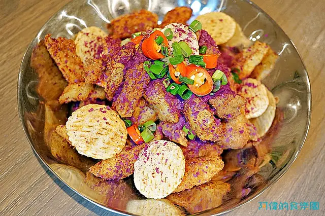 又是一道具有視覺衝擊的料理!很少見到這麼紫的顏色出現在炸雞上,原來它紫地瓜做成的,類似雪片般飄散在上面。