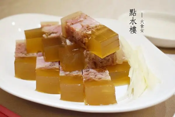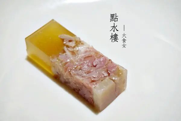 ▼色澤剔透如水晶的鎮江肴肉,吃起來其實就像果凍般!下方帶點胭脂色的肴肉,帶有點金華火腿的味道,整體吃起來絲毫不油膩、很清爽
