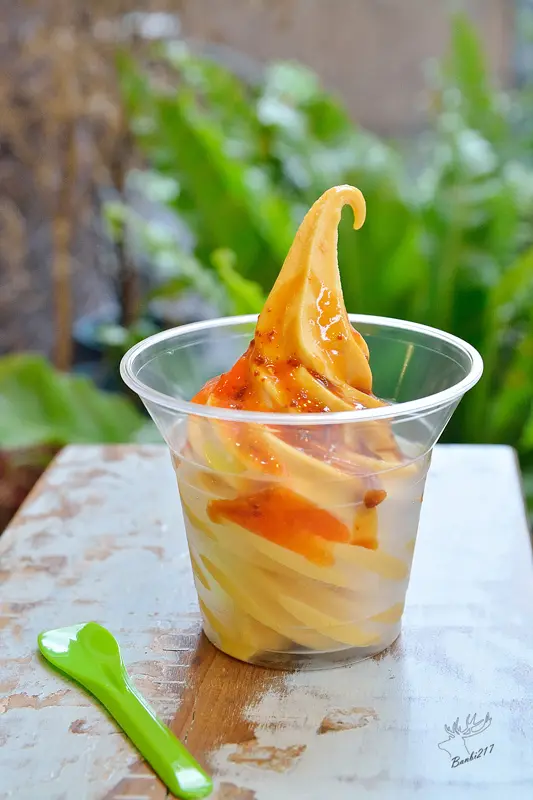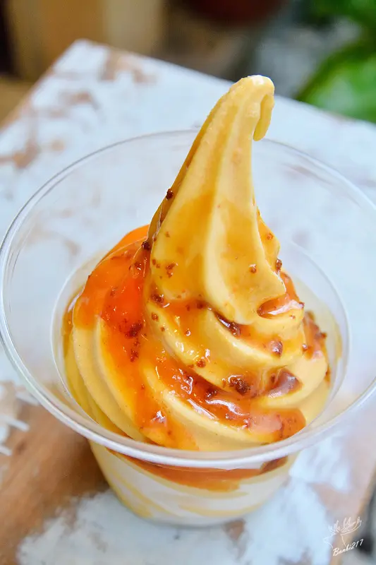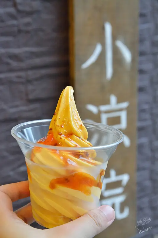 日本甜柿霜淇淋為採用台灣種植的富有甜柿、次郎甜柿製作,霜淇淋口感綿密,透著淡淡且自然的柿子果香,還吃的到柿子皮肉,上方的太妃糖醬也很香甜,但淋上了太妃糖醬的那一表面較易蓋過柿子的味道。不過也因為太妃糖醬給的量很適中,還是能吃到柿子的香氣,整體而言還不錯且口味市面少有。喜歡小涼院霜淇淋的原因在於,因他們家我吃過三次中,奶量與水果比例很適中,不會有油脂感太厚而太口乾情形。
