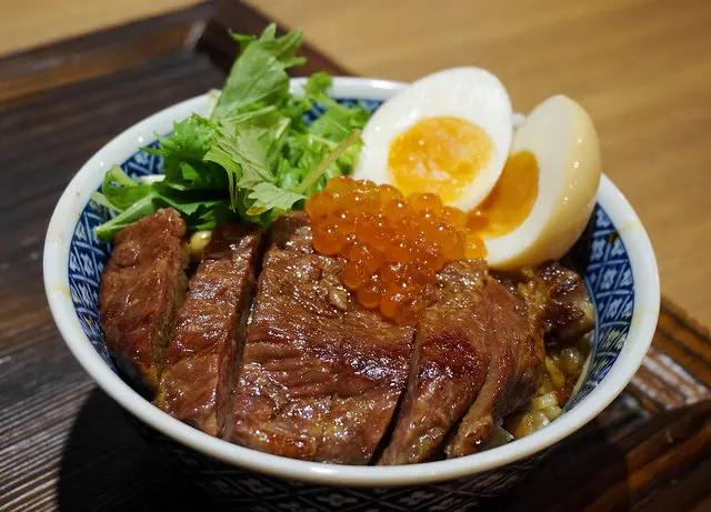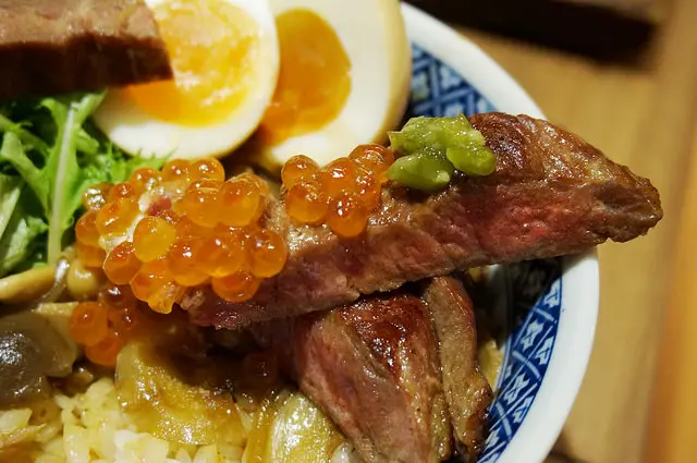 飯上面鋪著一整片霜降沙朗牛排,鮭魚卵點綴其中