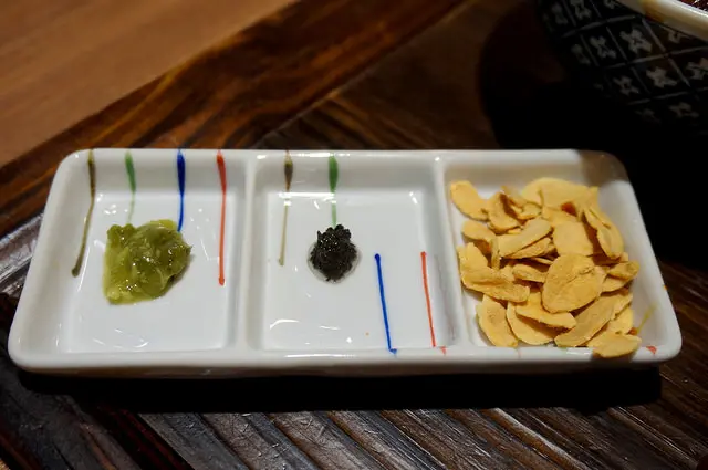 附上三款調味:烘炸蒜片/松露醬/山葵絲