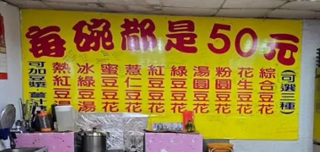 在店面的攤車後方就是內用座位,有歷史痕跡的招牌上,寫著豆花30元,即便這麼多年來漲到50元,以信義區的物價來說,cp值真的很高。
