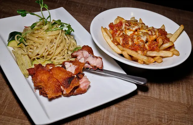 ●去骨雞腿排義大利麵與起司肉醬炸薯條