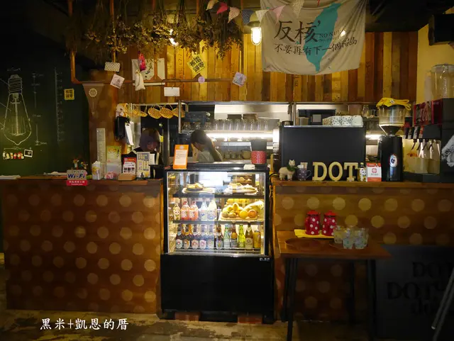 從櫃檯、店裡的柱子、餐桌布、杯子都有"點點"
