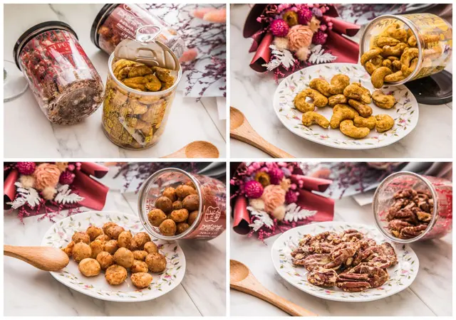包裝也很有質感,都是真空包裝,透明罐子上也印有吉祥寓意的字樣,拉開拉環即可食用,吃不完再蓋回去就好,罐裝也很好攜帶,口味上調味也恰到好處不死鹹,咖哩腰果口味很特別,有股咖哩清香,七味夏威夷豆帶點微辣刺激感,很涮嘴,蜜糖胡桃則是小朋友最愛,甜脆甜脆很耐吃