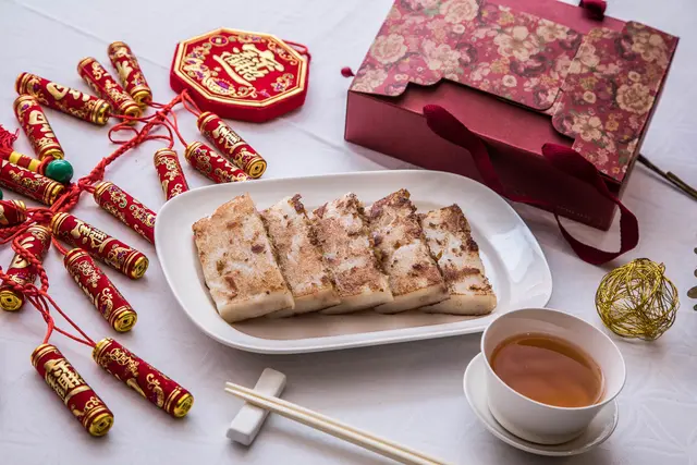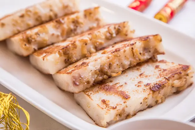 臘味金蝦港式蘿蔔糕以金鉤蝦、臘腸爆香,蘿蔔切成細絲混入米漿內炊蒸,特別用臘腸及蝦米鋪了頂層,以鴻運當頭為新春吉祥寓意,就連裡面也有拌入,主廚下手真的不手軟,誠意滿滿!