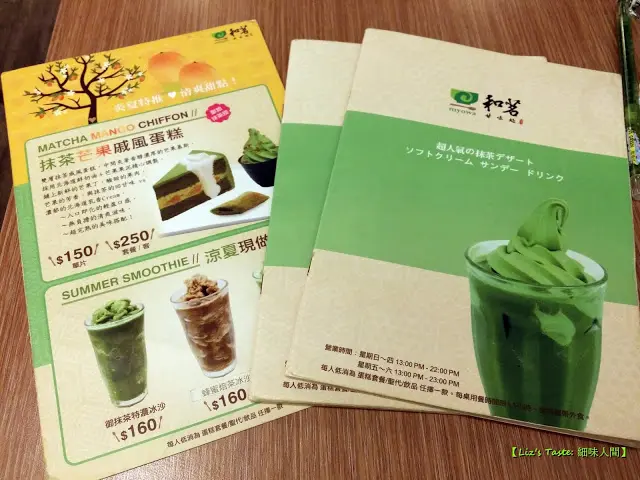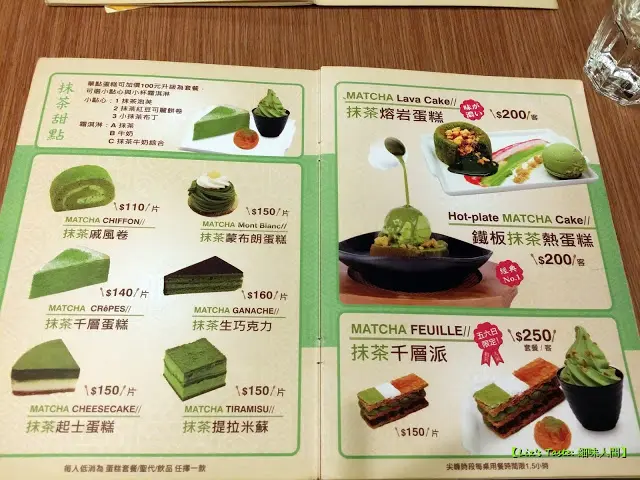 再細看餐牌,主要提供各套餐,均是以抺茶味雪糕作膽(另外可選牛奶或抺茶牛奶綜合味道),再拼一款抺茶甜品如Chiffon, Crepes, Cheesecake或Tiramisu等,與一份小點心,價錢為NT210-250一客,當然顧客也可以選擇單點形式,悉隨尊便,只怕選擇太多花多眼亂啊。