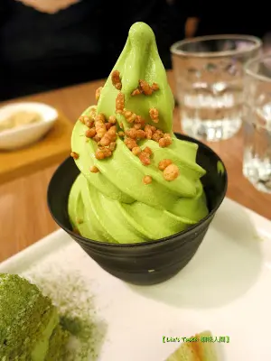 稍候片刻先是抺茶甜點套餐: 抺茶軟雪糕、抺茶提拉美蘇及抺茶紅豆可麗餅卷 (NT250)被呈上,眼前是令人心花怒放的驚喜,首搶眼球的抺茶軟雪糕,外形美觀筆直,面頭灑上脆脆玄米,增添香氣與口感,舀一口入咀裡,冰涼軟滑口感即時湧現,抺茶香氣優雅細緻,甘苦味平衡,淡淡餘韻縈繞口腔。