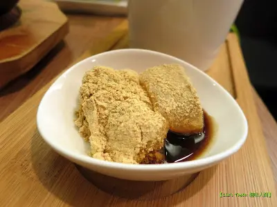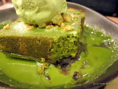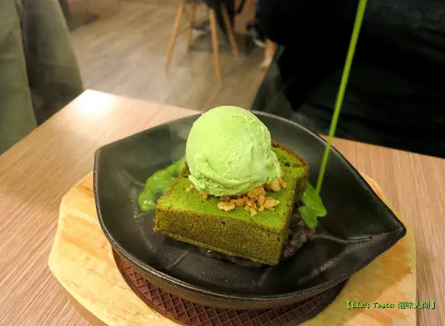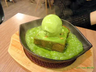 而抺茶蛋糕上放上一球大大的抺茶雪糕,圓渾豐滿,與墊底的抺茶蛋糕是冷熱交融的共同體,這件厚厚蛋糕是意想不到的鬆軟富彈性,抺茶味道濃郁,受鐵板熱力散發陣陣香氣,蘸些濃厚抺茶漿同吃,口味更馥郁豐富,味蕾開心得升上半空!