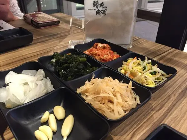 有醃蘿蔔、海帶芽、泡菜、生大蒜、牛蒡絲和黃豆芽