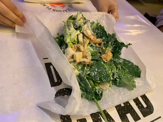 服務生幫我們點完餐後,會遞給我們螃蟹髮箍和圍兜兜,最後幫我們鋪上餐巾紙,等等所有食材都是倒在餐巾紙上頭,也提醒我們可以到後方先洗手