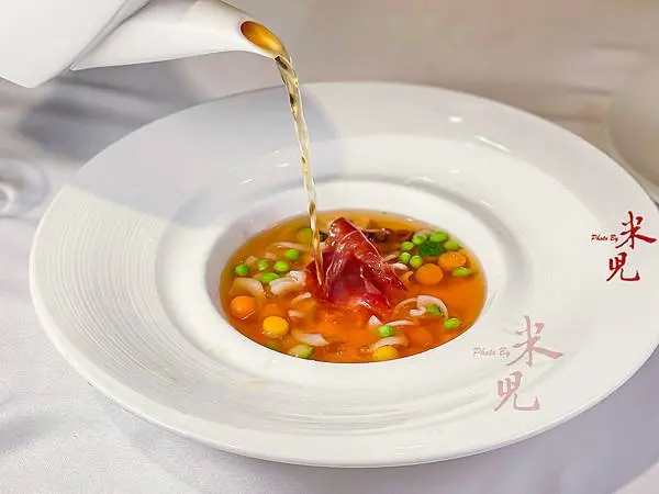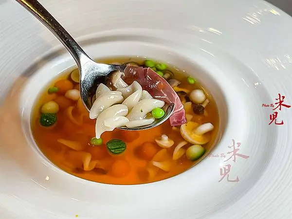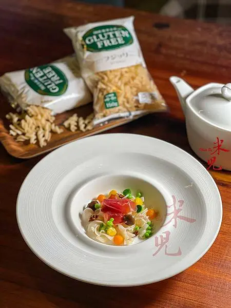 曉芳師傅運用法式澄清雞湯來提出無麩質義大利麵的美味,湯裡除了特別剪成小塊的螺旋麵,還有甜豆仁、南瓜圓丁、櫛瓜圓丁、等蔬菜,並用伊比利火腿引出旨味,這麵體吃起來滑溜Q彈,比義大利麵的口感有過之而無不及,我一邊吃著,就一邊想著這麵體還能用來做什麼菜了哩!用米做的麵條居然可以如此可口,令人印象深刻。
