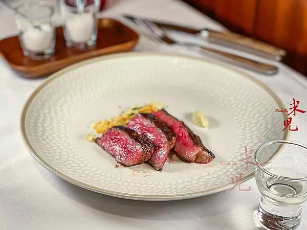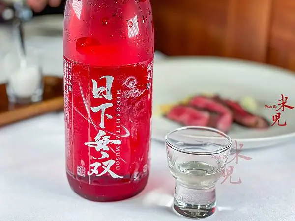日本A5和牛紐約克牛排X日下無雙純米60,這款瓶身為寶石紅的清酒,光是瓶子就很吸睛,因為是用了兩種酵母於不同酒槽發酵,呈現了很有個性的酒感,用來搭配油脂豐厚的和牛,真的再對味也不過。