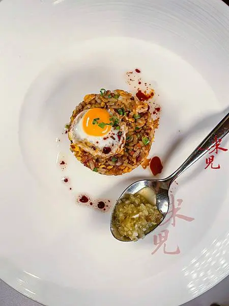 日式炒飯。牛排教父鄧有癸師傅發跡於鐵板燒餐廳,所以他對日式鐵板炒飯自是十分擅長,這次運用這款米粒較小的「秋田小町」米來做炒飯,事前也做了多次的嘗試。因為這款米吸水性低,所以用適量比例的水份和浸煮的烹調方式,能呈現米粒本身的彈性與粒粒分明的口感,師傅在煮飯時特別添加了用洋蔥、培根、青椒炒過的香料油,讓米飯在炊煮過程中就飽吸香氣,最後再用鐵板手法來炒,炒出來的飯真的是鬆化鹹香,搭配迷你煎鵪鶉蛋,小小一分就讓人大大滿足。