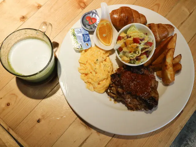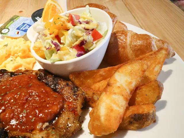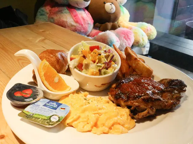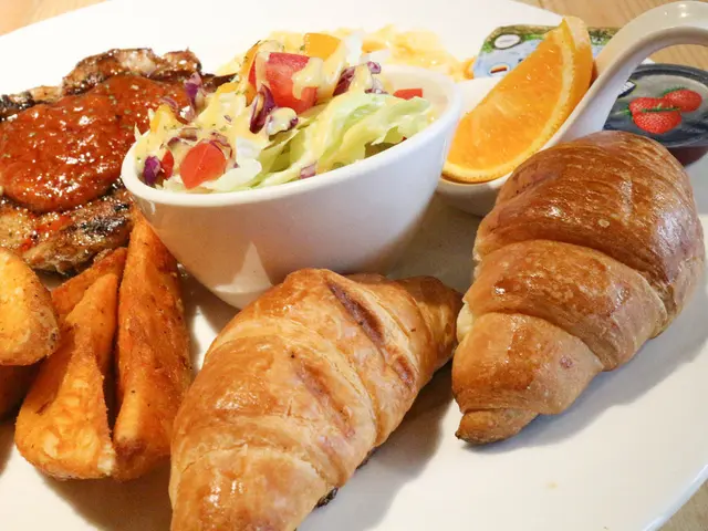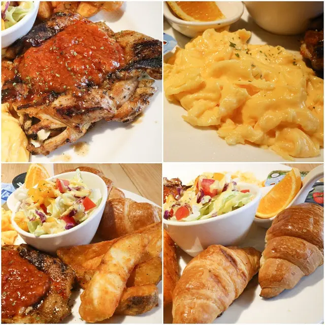 火烤雞腿排,有機炒蛋,薯塊,義大利肉醬,沙拉,麵包我挑選可頌(附奶油與果醬)