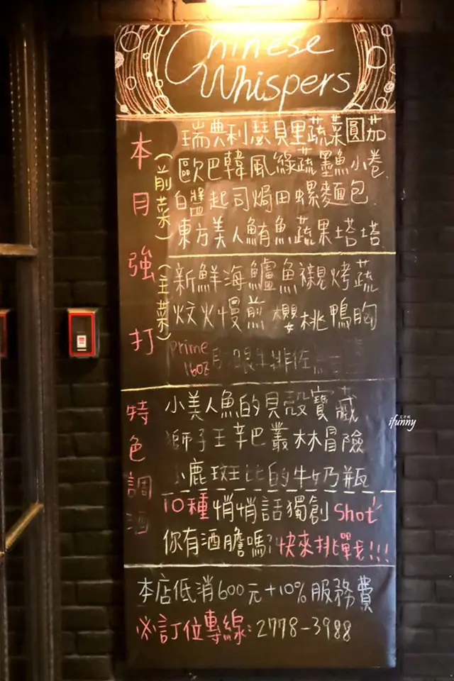 Chinese Whispers悄悄話餐酒館在門口的小黑板上,寫上了推薦菜色,前菜是多元化的異國風,主菜有排餐,光看這些餐點就覺得Chinese Whispers悄悄話餐酒館肯定有個不錯的廚房或主廚。另外有自家獨創的Shot,也歡迎有酒膽的朋友來挑戰!