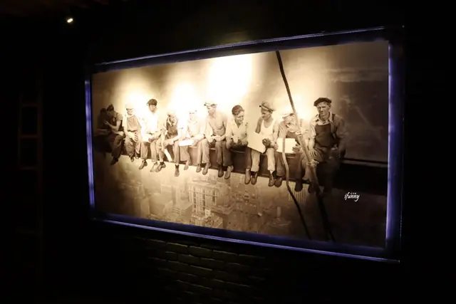 這是一張很知名的照片,好幾位建築工人坐在高空的樑柱上休息的模樣,對於有懼高症的艾方妮而言,實在無法想像他們悠閒的心情,但卻是代表出人在苦悶的生活中,總是得自己找樂子。