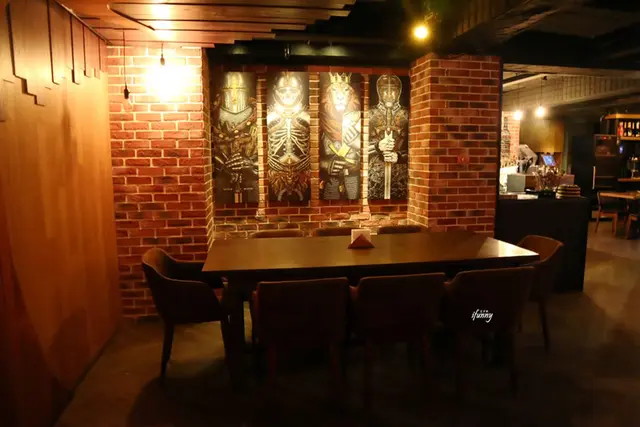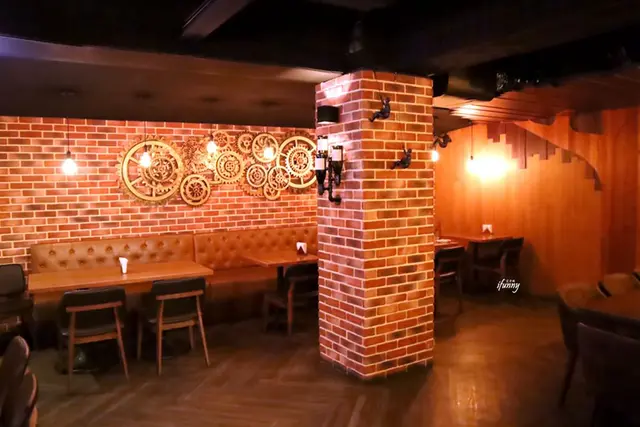 在吧檯的另一邊還有更寬敞的用餐區,以紅磚牆搭配皮沙發,也很有異國風情。