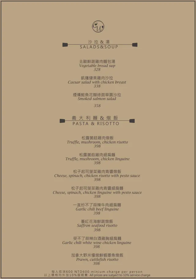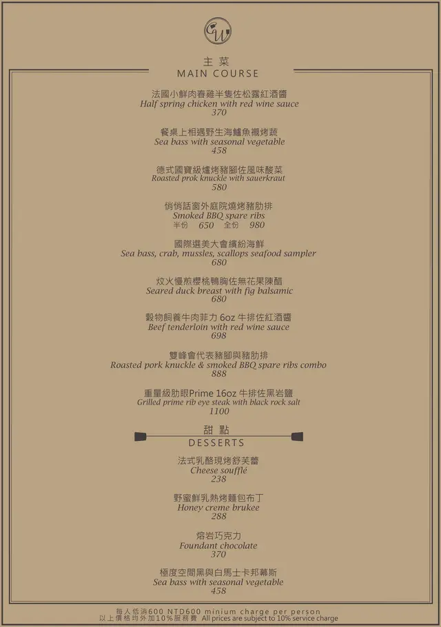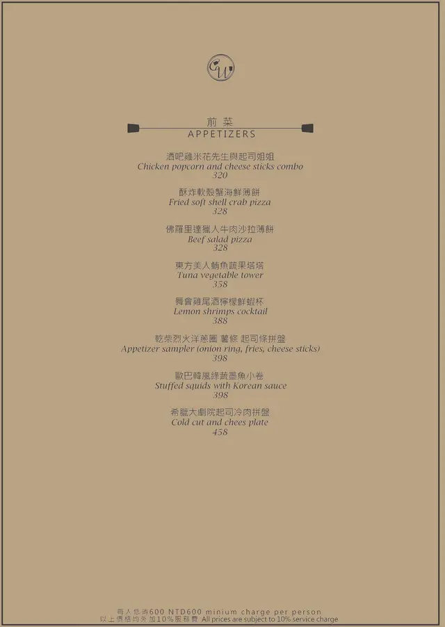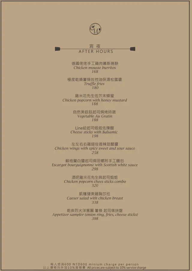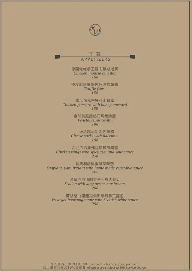 每人低消為$600,並另加10%服務費。