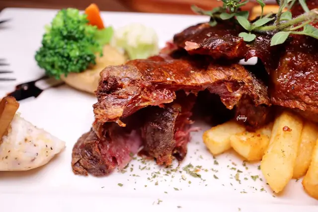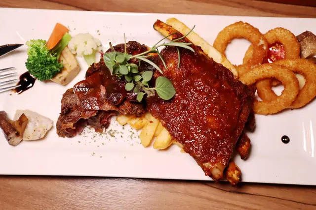 由其餐名就可知道這道料理的主角是豬腳及豬肋排。一旁飾以時蔬、洋蔥圈及薯條。