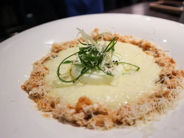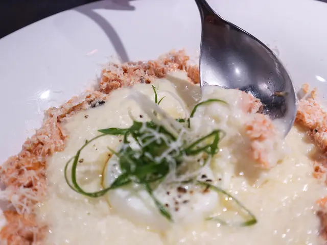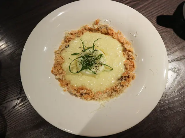 撥碎的鮭魚肉灑滿一圈在白色燉飯週圍!