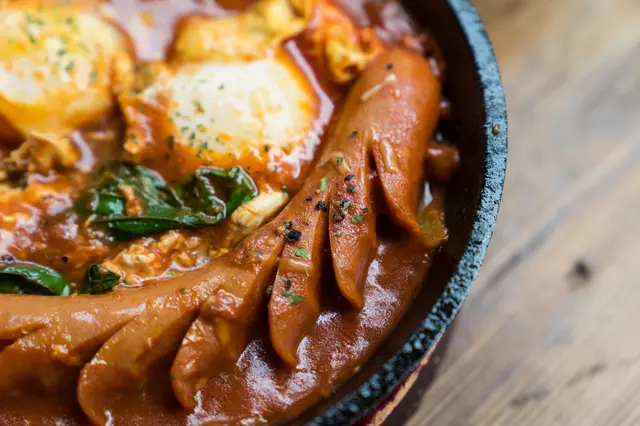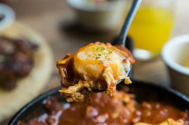 以鑄鐵鍋所盛裝,布娜飛特製蕃茄Sauce,口感不會太過濃稠,能感受到番茄的酸度,裡頭還有拌炒著培根末、洋蔥丁,乳酪絲增添口感及香氣。上頭打上兩顆雞蛋,蛋黃部分半熟狀態,麵包也可以沾上蛋液享用。