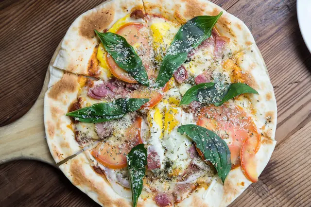 手工窯烤披薩也是布娜飛的招牌之一!使用石頭磚窯來烤製,餅皮都是店家手桿自製,口感是很薄脆的那種!披薩口味頗多,這款布娜飛為經典款式,蕃茄醬為底,鋪上培根、洋蔥、酸豆、羅勒,中間再打上一顆生雞蛋!