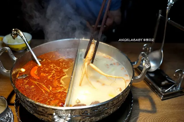 養生鍋底的白湯裡頭藏著各式中藥材.比較特別的是整根的人蔘