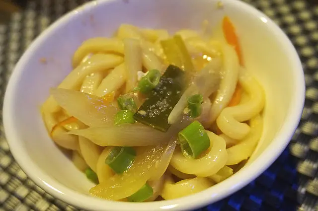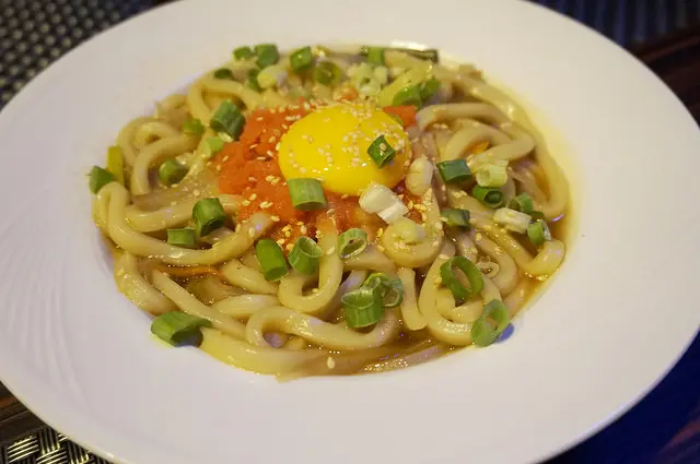Q滑的烏龍麵,拌上明太子醬和生蛋黃,味道帶著微酸的清爽,伴隨青蔥的香氣