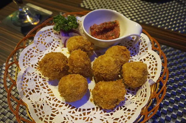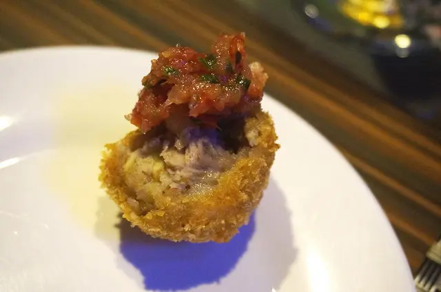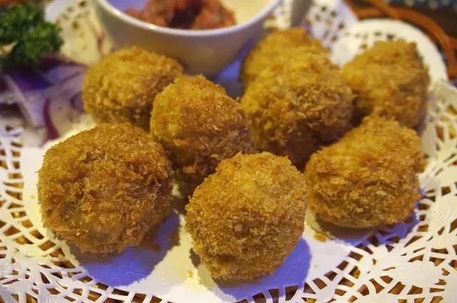 看起來雖然是西式炸肉丸,但肉餡吃起來帶有熟悉的甜味,原來是台式香腸呢!
