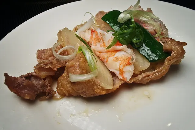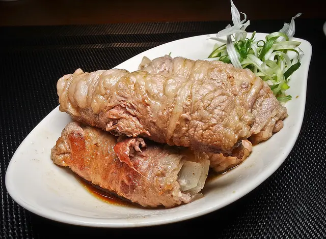 中間包著洋蔥, 蔥絲, 黃瓜, 與鮮蝦作成的牛肉卷