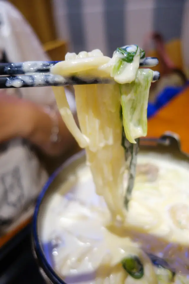 挾起烏龍麵,很清楚的看的出來牛奶起司都巴在麵體上~