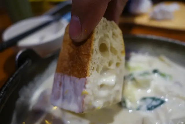 火鍋所附的麵包,可以沾上牛奶起司一起食用,有點享用起司鍋的FU~