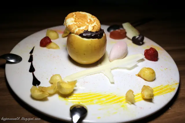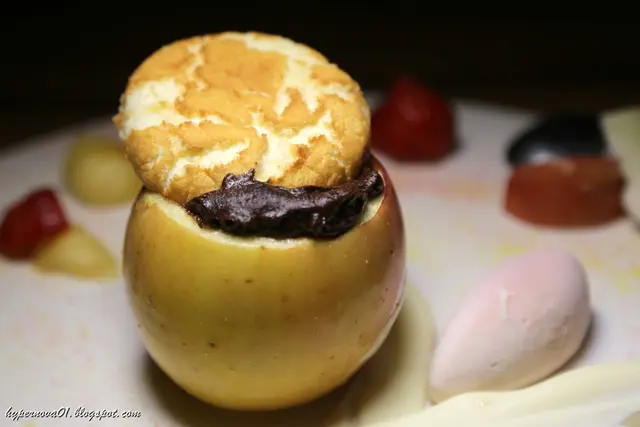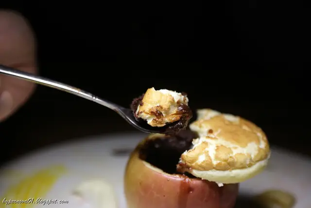 以蘋果為中心裝承著熱巧克力泥覆蓋一片蛋糕