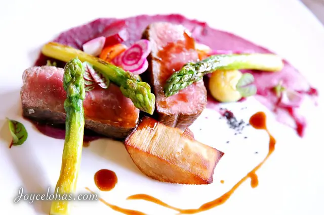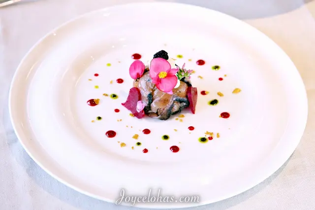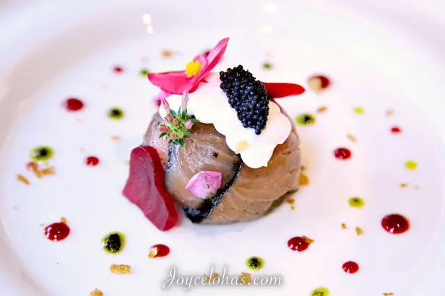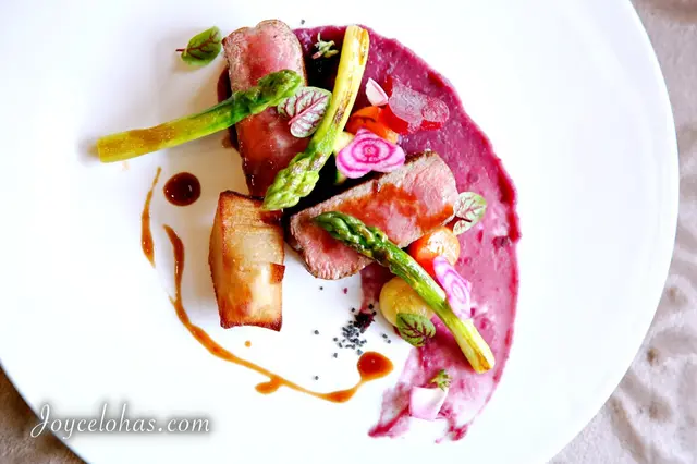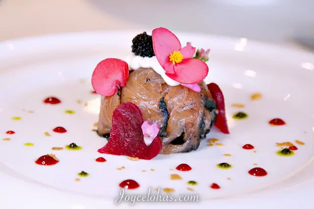 用龍眼木和各式香料做煙薰,生食級的挪威鮭魚拌入蘋果、洋蔥、茴香、橄欖油、檸檬汁和檸檬皮等等,再一片片包裹成球狀,上面加上魚子醬和水牛起司,盤上用紅莓醬、青醬、洋芋等裝飾,特別應景情人節,將甜菜根做成愛心形狀,亮眼的擺盤,讓我們一看到馬上心花怒放!