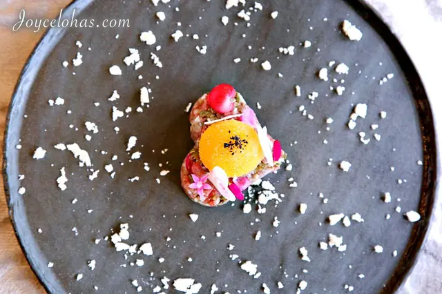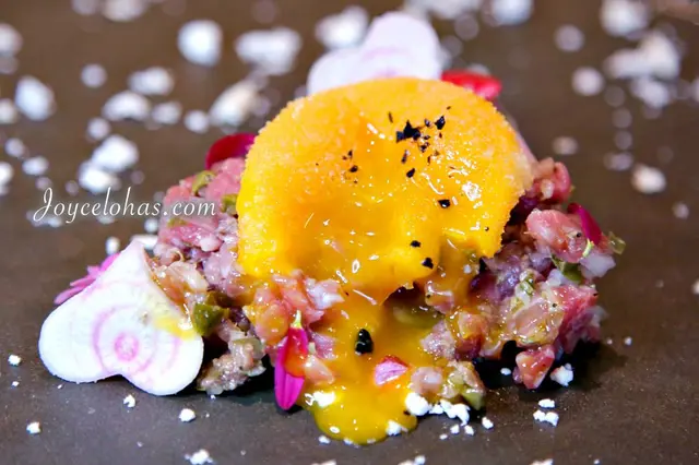 切成小丁狀的牛菲力,加入酸豆、堤魚及紅洋蔥 拼成浪漫的心型,最特別的是中間是主廚特製炸過的整顆半熟蛋黃!旁邊搭配櫻桃蘿蔔裝飾,居然還做成一個個小愛心呈現,實在太可愛!