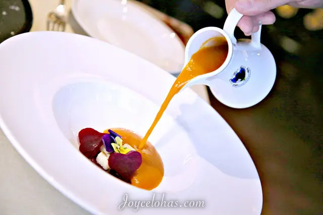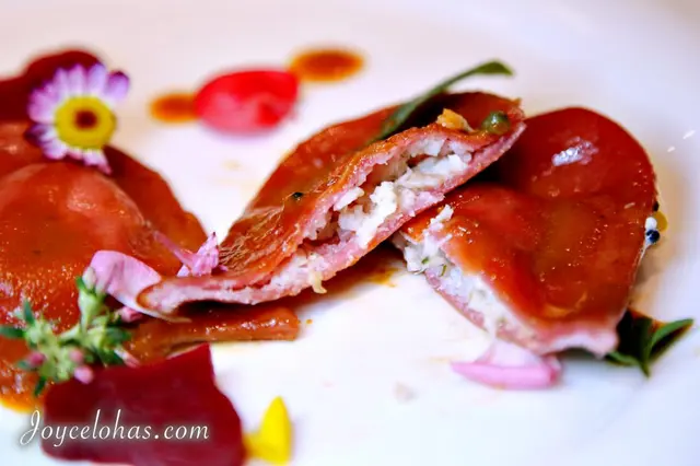 餃皮是使用甜菜根作調味,內餡是阿拉斯加鱈魚慕斯,再搭配慢熬的蝦膏高湯提煉成濃郁的蝦醬汁,一旁用番茄醬汁和甜菜根點綴裝飾。