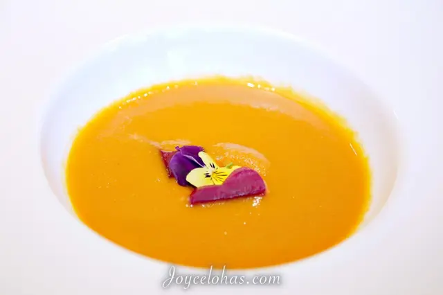 ▼用新鮮番茄加上紫地瓜泥、甜菜根、麵包丁及金色洋芋碎片,還加入帕瑪森起士,倒入湯後可以一起搭配著邊喝邊吃。