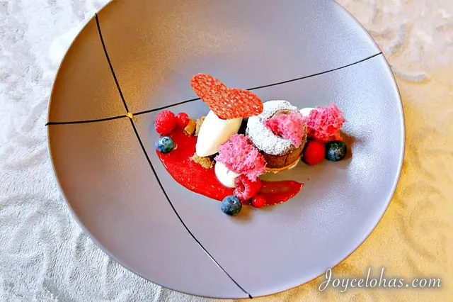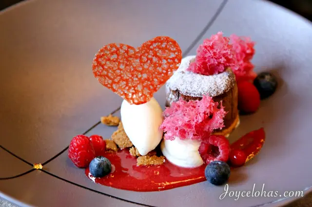 ▼使用70%高純度頂級巧克力搭配香草冰淇淋,一旁再淋上用覆盆莓、草莓及紅酒調製成的紅莓醬汁和新鮮藍莓、覆盆莓、菠蘿碎和海綿蛋糕體。