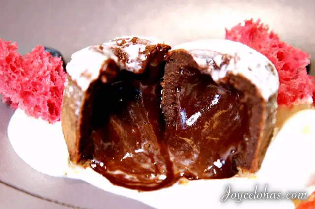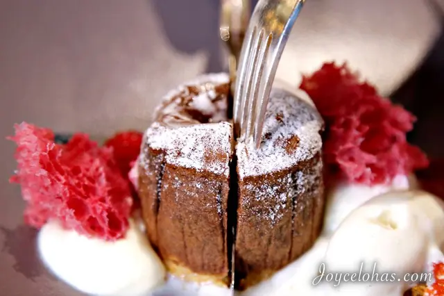 外酥內軟,巧克力暖呼呼入口融化出迷人的夢幻苦甜,濃郁衝腦,再來一口搭配手工香草冰淇淋冷熱交織的衝擊,微苦的巧克力與爽口香草風味融合,再搭配一旁的酸甜紅莓醬汁,多變的層次在口中迴盪,宛如戀愛般的酸甜滋味,使人陶醉! 可以說是各方面都滿分的巧克力熔岩蛋糕呀!