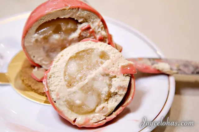 像冰淇淋般的慕斯質地,冰沁入口即化,甜美奶香與西洋梨相互融合,真吃得到的果肉,隱約飄出淡淡的黑糖香氣讓我瞬間驚醒,有慕斯的柔和細膩,有西洋梨的多汁,還有底層脆餅的香脆,口感上多變的層次讓人不愛上都難! 如果上一個甜點像是愛情酸甜滋味,這款就像是愛情甜蜜蜜的感覺囉 😉