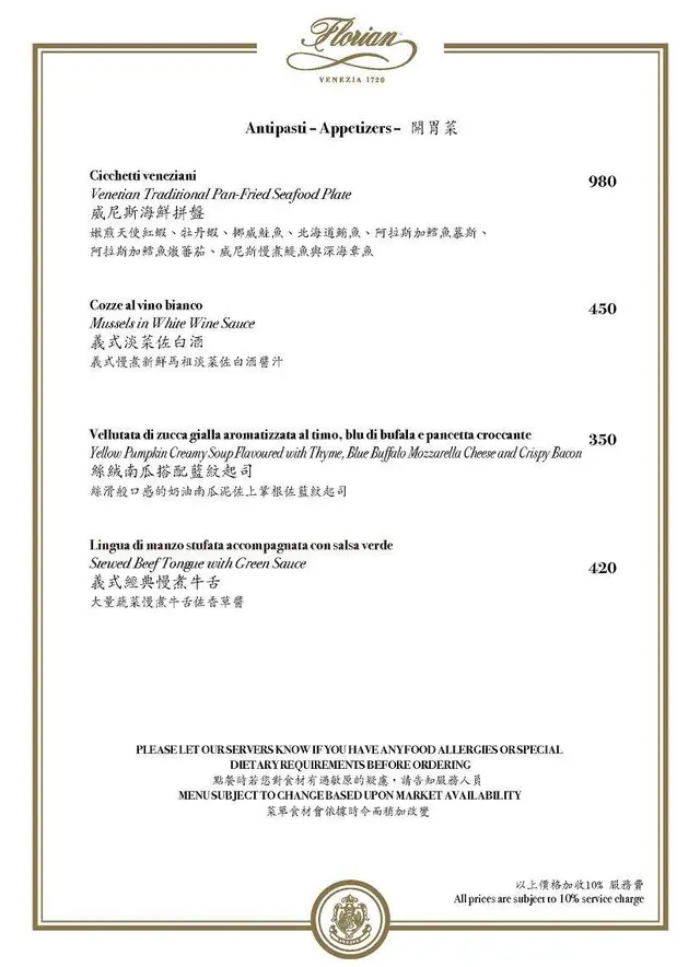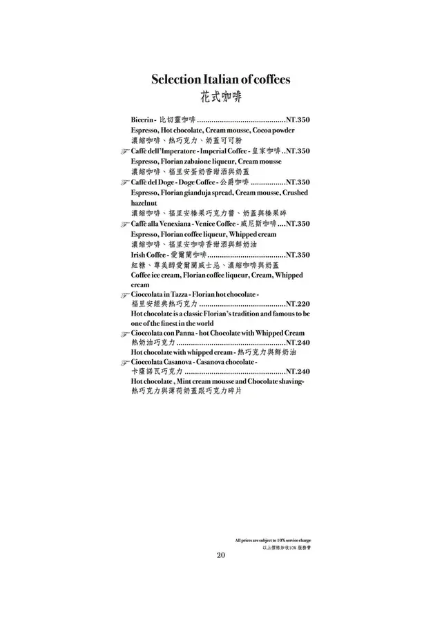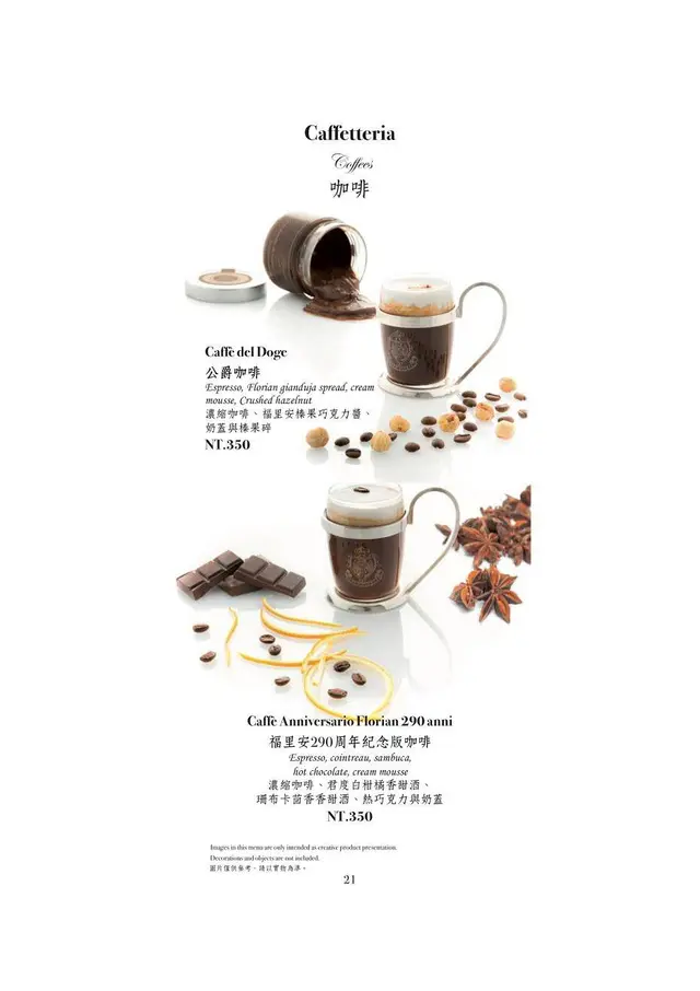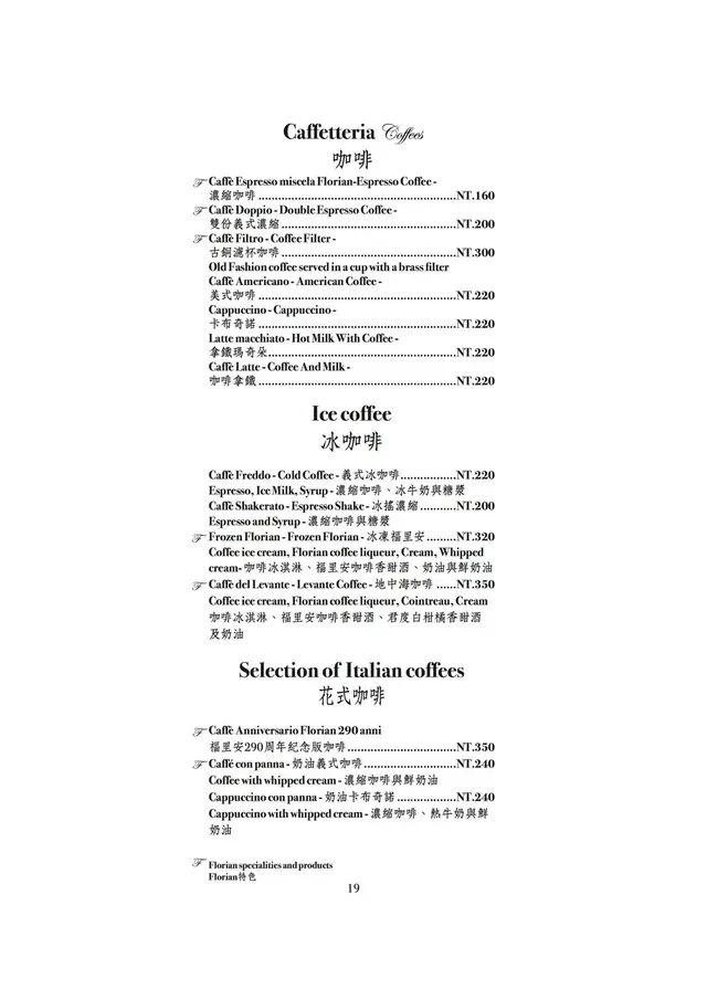 在威尼斯聖馬可廣場最富盛名的咖啡廳「福里安花神」,與巴黎花神咖啡館不同,威尼斯的花神咖啡館更以古典華麗的裝潢聞名,當地店內分成露天和室內兩部分,還有現場露天音樂表演,可以一邊曬著太陽喝著咖啡,一邊聽著悠揚的琴聲,閉眼想想就可以感受其美妙啊! 擁有三百年豐沛的藝文歷史,從貴族商賈到大文豪馬可吐溫、安迪沃荷與卓別林、香奈兒女士coco都曾造訪。之前就期待有機會去威尼斯旅遊必定要到訪花神本店一探究竟,沒想到在17年已經來台灣展店,還直接將當地菜單原汁原味搬過來,真是太讓人躍躍欲試。
