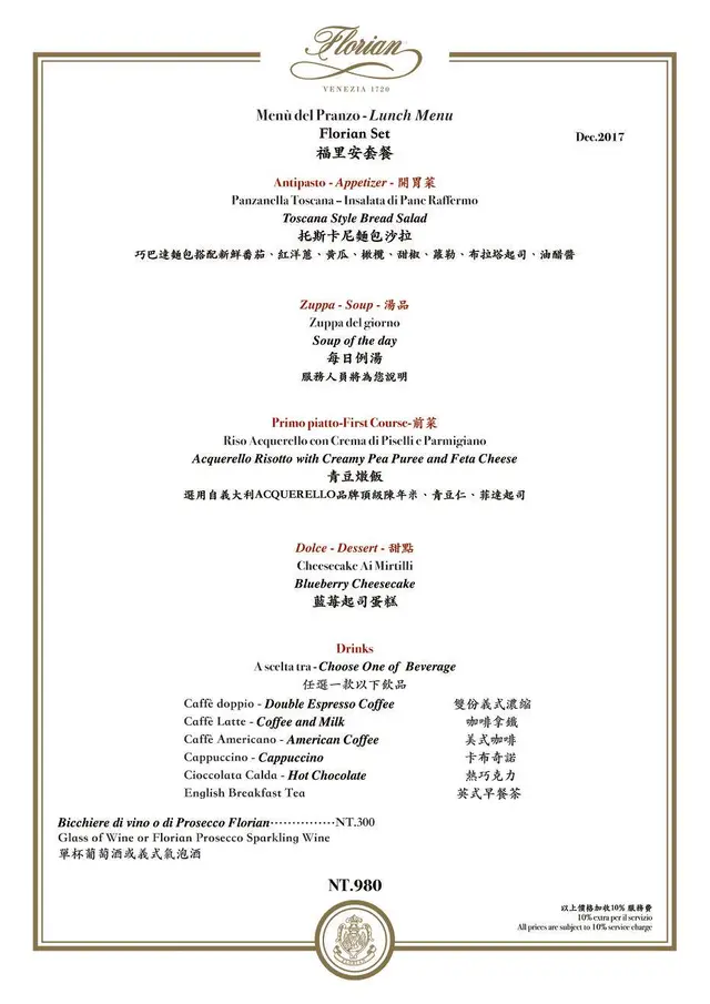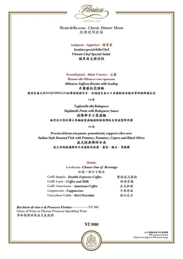 套餐內容包含:開胃菜+湯品+前菜+主餐+甜點+飲品,綜合整體評價,來自義大利的經典老店,位處黃金地段交通方便,裝潢典雅華麗,服務好、氣氛佳,重點是餐點賞心悅目又美味,$1980/套(人) 可以吃到如此等級的西式情人節限定餐,價位相當合理。