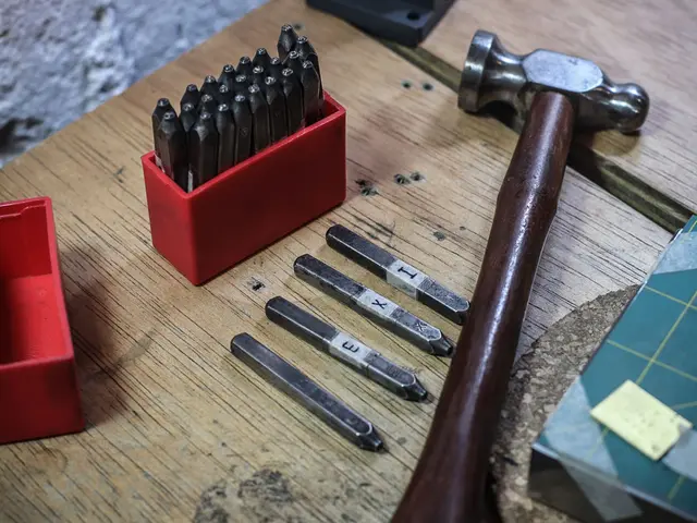 再來有一盒刻著英文字母的工具與一塊方形的金屬片讓你先試打,不要害怕自己手殘,多打幾次就上手了,主要工作就是拿著榔頭、對準,往下敲!