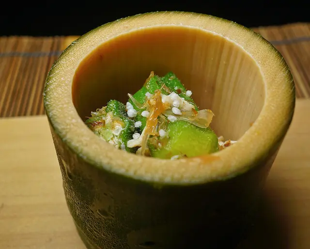 Okra , 最近常見到有人在日料中使用, 秋葵簡單川燙後搭配蒸過的雞肉絲,簡單清爽